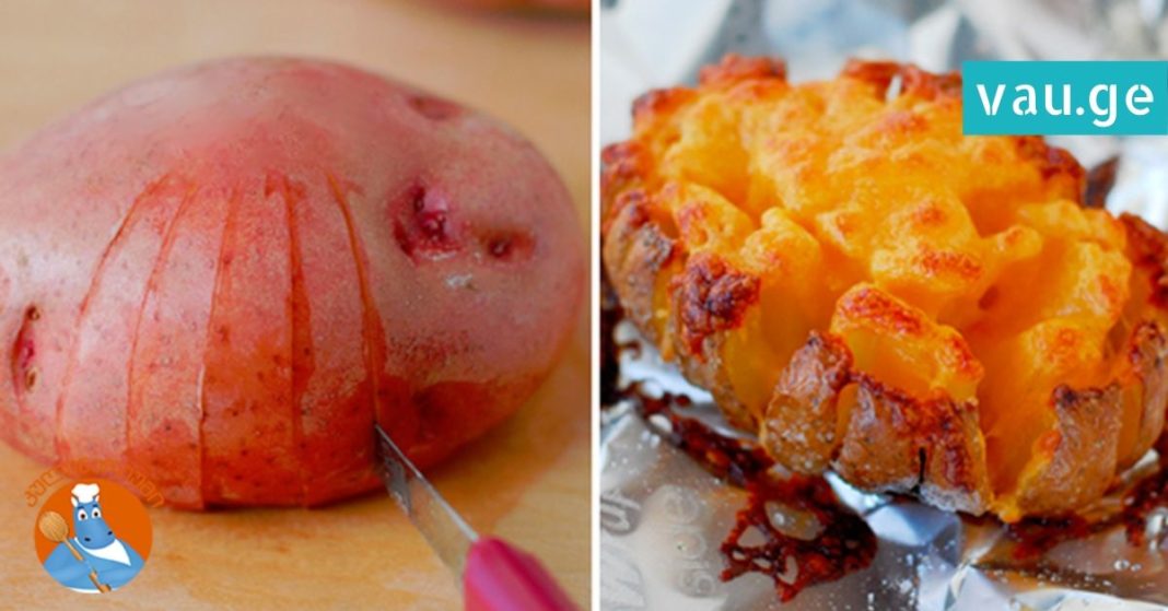 Once you’ve made the cuts, flip the potato back over. You should see a slightly sculpted and patterned shape forming—almost like a flower or spiral. Don’t worry if it doesn’t look perfect; the baking process will enhance the shape and texture.