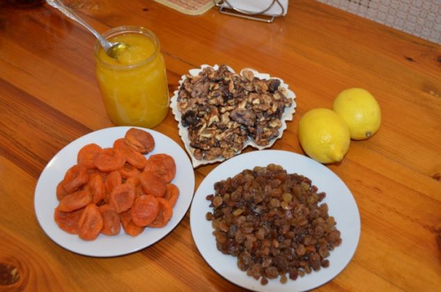 Blend together 1 cup each of plums, dried apricots, walnuts, and raisins. Add honey and 1–2 lemons (with the peel). Alternatively, you can use aloe vera juice instead of lemon. Take 1–3 tablespoons daily for best results.